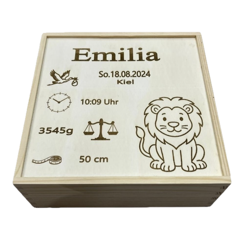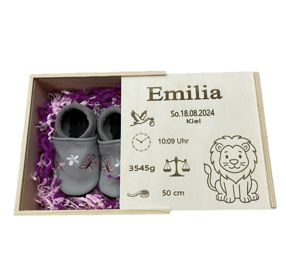 Für Schühchen in einer stabilen, naturbelassenen Holzbox. Der Deckel wird individuell nach Wunsch graviert – mit dem Namen des Babys, Geburtsdatum, Geburtszeit, Gewicht, Größe und dem Geburtsort. Zusätzlich kann ein Motiv wie zum Beispiel ein Löwe, eine Waage oder andere Symbole integriert werden. Jede Gravur erfolgt präzise und mit großer Sorgfalt, sodass ein hochwertiges, langlebiges Erinnerungsstück entsteht.