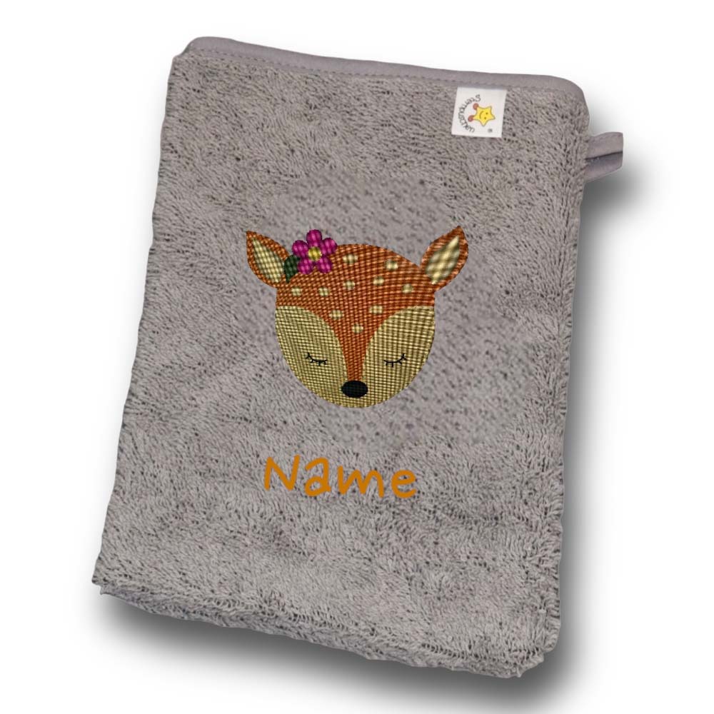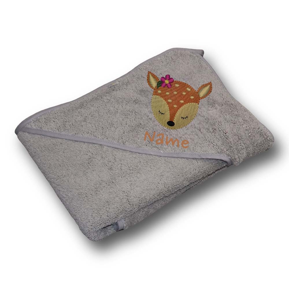 abgebildet ist, in diesem Fall Kapuzenbadetuch Reh auf grau