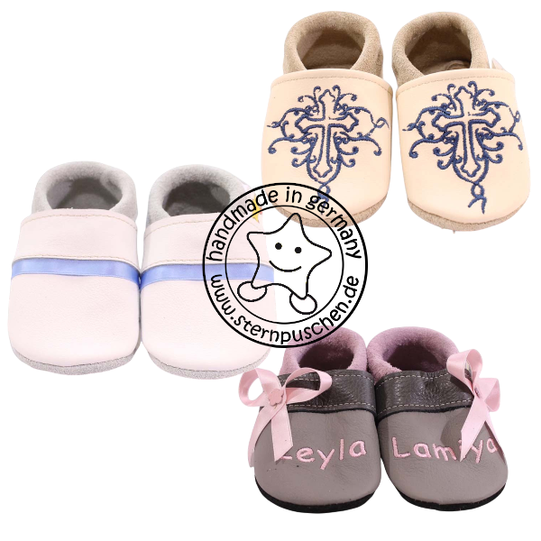 Die Puschen können auf Wunsch mit einem Namen bestickt werden – dies ist eine freiwillige Zusatzoption und keine Pflicht. Je nach Modellvariante wird der Name auf dem Lederband, vorne über dem Motiv oder an der Ferse bestickt.