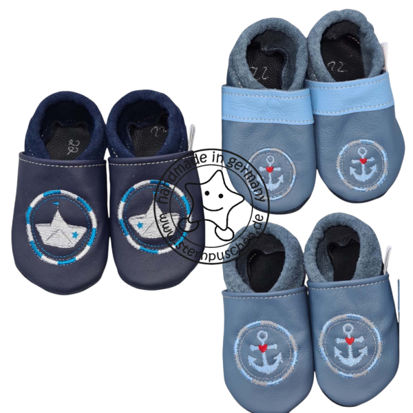 Die Puschen können auf Wunsch mit einem Namen bestickt werden – dies ist eine freiwillige Zusatzoption und keine Pflicht. Je nach Modellvariante wird der Name auf dem Lederband, vorne über dem Motiv oder an der Ferse bestickt.