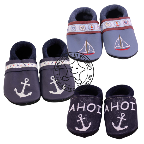 Liebevoll handgefertigte Lederpuschen mit dem Motiv Anker.