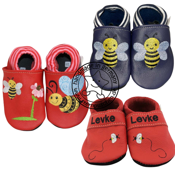 Liebevoll handgefertigte Lederpuschen mit dem Motiv Biene.