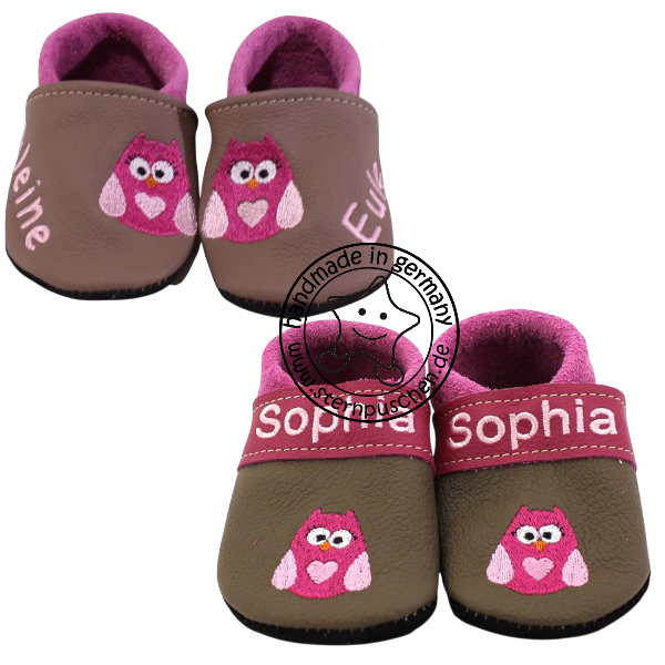 Liebevoll handgefertigte Lederpuschen mit dem Motiv Eule.