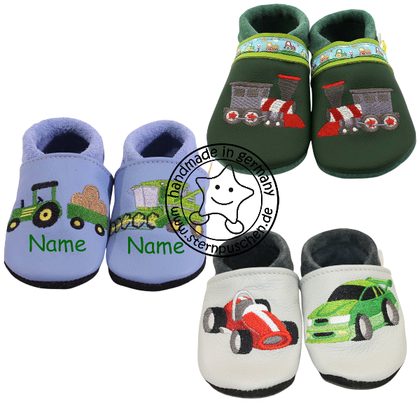 Die Puschen können auf Wunsch mit einem Namen bestickt werden – dies ist eine freiwillige Zusatzoption und keine Pflicht. Je nach Modellvariante wird der Name auf dem Lederband, vorne über dem Motiv oder an der Ferse bestickt.