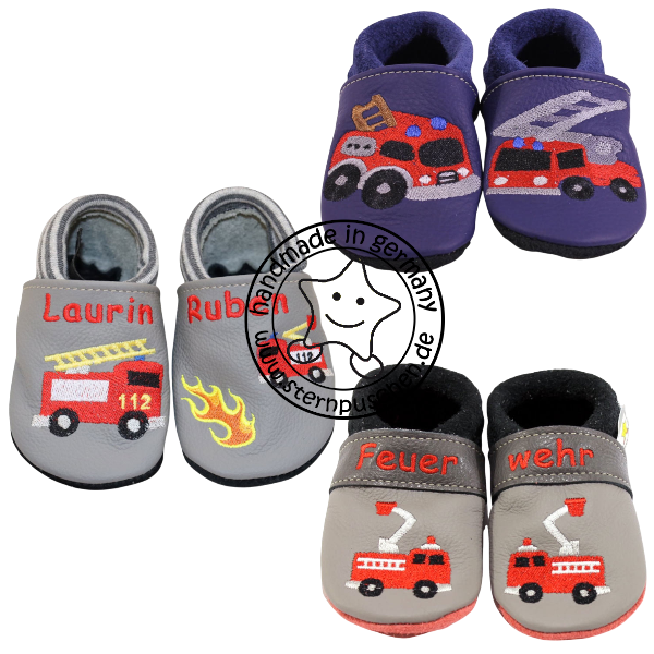 Liebevoll handgefertigte Lederpuschen mit dem Motiv Feuerwehr.
