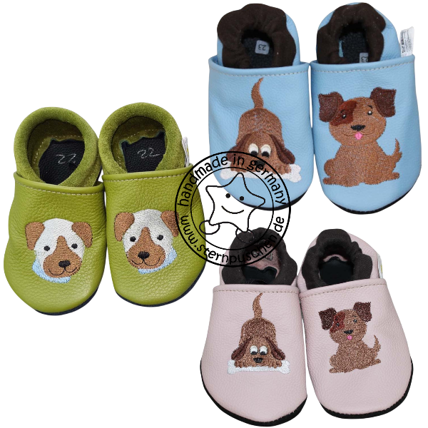 Die Puschen können auf Wunsch mit einem Namen bestickt werden – dies ist eine freiwillige Zusatzoption und keine Pflicht. Je nach Modellvariante wird der Name auf dem Lederband, vorne über dem Motiv oder an der Ferse bestickt.
