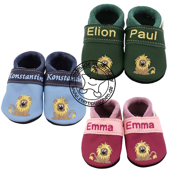 Die Puschen können auf Wunsch mit einem Namen bestickt werden – dies ist eine freiwillige Zusatzoption und keine Pflicht. Je nach Modellvariante wird der Name auf dem Lederband, vorne über dem Motiv oder an der Ferse bestickt.