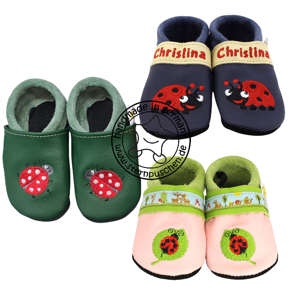 Liebevoll handgefertigte Lederpuschen mit dem Motiv Marienkäfer.