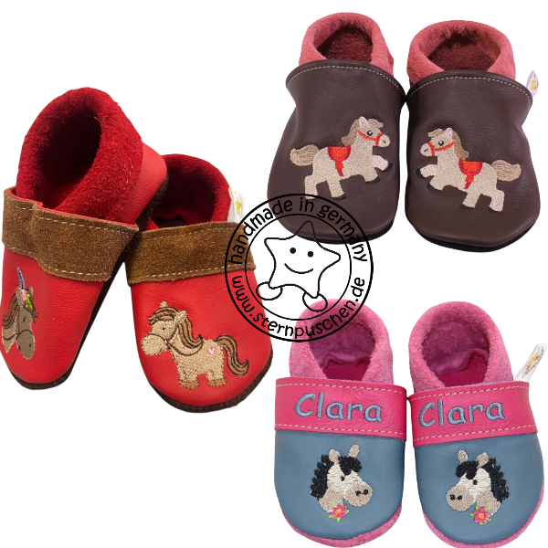 Liebevoll handgefertigte Lederpuschen mit dem Motiv Pferd.