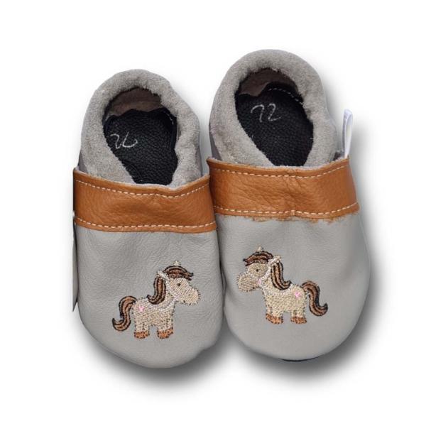 Liebevoll handgefertigte Lederpuschen mit dem Motiv Pferd.