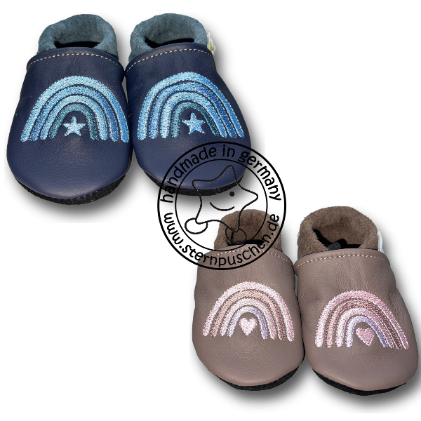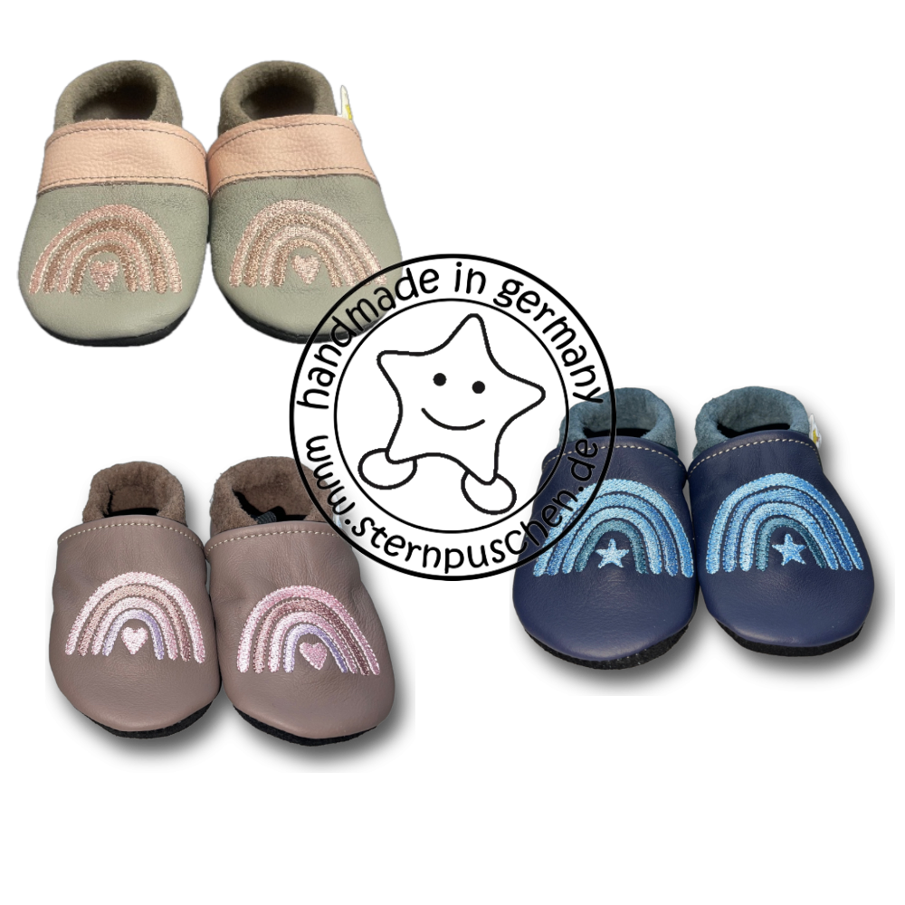 Liebevoll handgefertigte Lederpuschen mit dem Motiv Regenbogen.