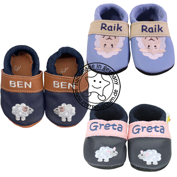 Die Puschen können auf Wunsch mit einem Namen bestickt werden – dies ist eine freiwillige Zusatzoption und keine Pflicht. Je nach Modellvariante wird der Name auf dem Lederband, vorne über dem Motiv oder an der Ferse bestickt.