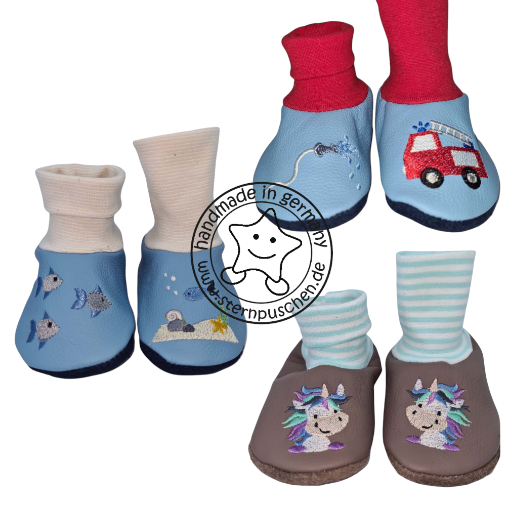 Liebevoll handgefertigte Lederschlupfis mit verschiedenen Motiv . Diese Puschen können auf Wunsch mit einem Namen bestickt werden – dies ist eine freiwillige Zusatzoption und keine Pflicht. Hinweis: Über der Auswahl der Modellvariante wird euch immer angezeigt, wo der Name beim gewählten Modell bestickt wird.