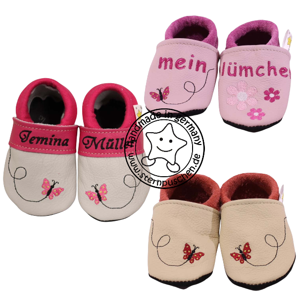 Die Puschen können auf Wunsch mit einem Namen bestickt werden – dies ist eine freiwillige Zusatzoption und keine Pflicht. Je nach Modellvariante wird der Name auf dem Lederband, vorne über dem Motiv oder an der Ferse bestickt.