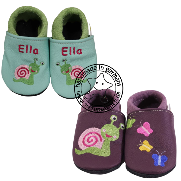 Liebevoll handgefertigte Lederpuschen mit dem Motiv Schnecke.