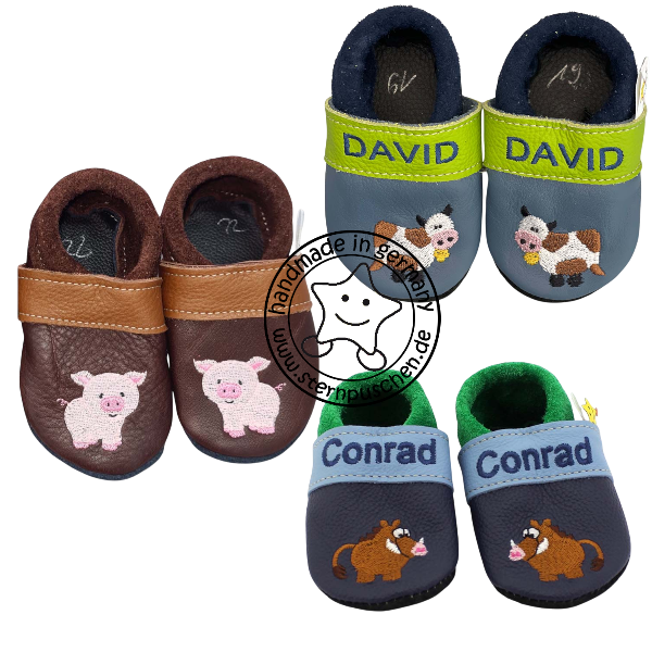 Die Puschen können auf Wunsch mit einem Namen bestickt werden – dies ist eine freiwillige Zusatzoption und keine Pflicht. Je nach Modellvariante wird der Name auf dem Lederband, vorne über dem Motiv oder an der Ferse bestickt.