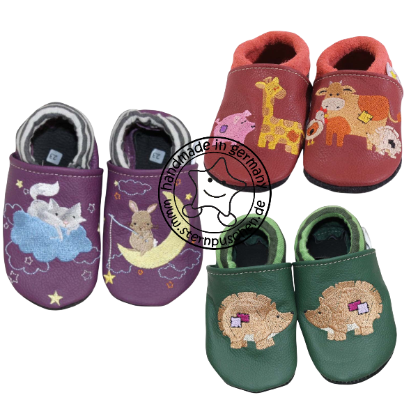 Liebevoll handgefertigte Lederpuschen mit dem verschiedenen Motiv .