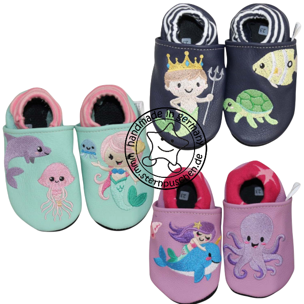Die Puschen können auf Wunsch mit einem Namen bestickt werden – dies ist eine freiwillige Zusatzoption und keine Pflicht. Je nach Modellvariante wird der Name auf dem Lederband, vorne über dem Motiv oder an der Ferse bestickt.