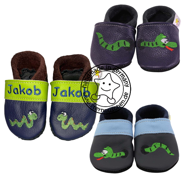 Die Puschen können auf Wunsch mit einem Namen bestickt werden – dies ist eine freiwillige Zusatzoption und keine Pflicht. Je nach Modellvariante wird der Name auf dem Lederband, vorne über dem Motiv oder an der Ferse bestickt.