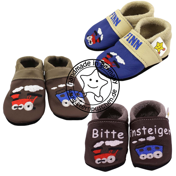 Liebevoll handgefertigte Lederpuschen mit dem Motiv Zug.