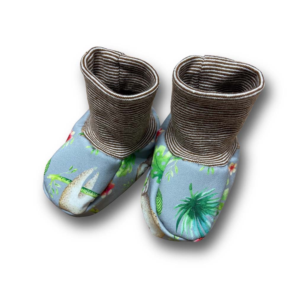 Die Bündchen bestehen aus 95% Baumwolle und 5% Elasthan. Babyschuhe haben ja leider gerne die Angewohnheit, ständig zu rutschen…. nicht bei diesen! Das Bündchen ist extra hoch, so dass es entweder einfach getragen werden kann unter oder über der Hose, z.B. um im Tragetuch oder der Baby-Trage die Knöchel zu schützen. Oder man klappt es um und trägt es doppelt, dann sind die Schuhe besonders gegen Rutschen geschützt.