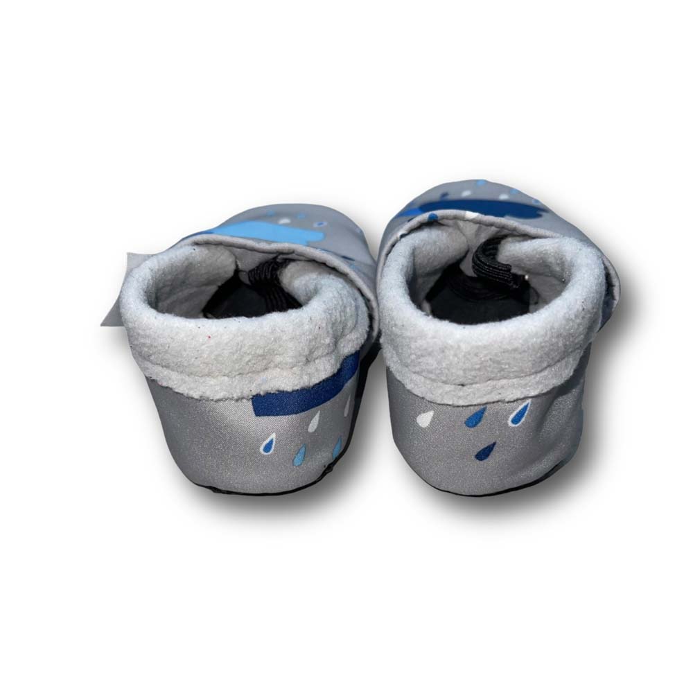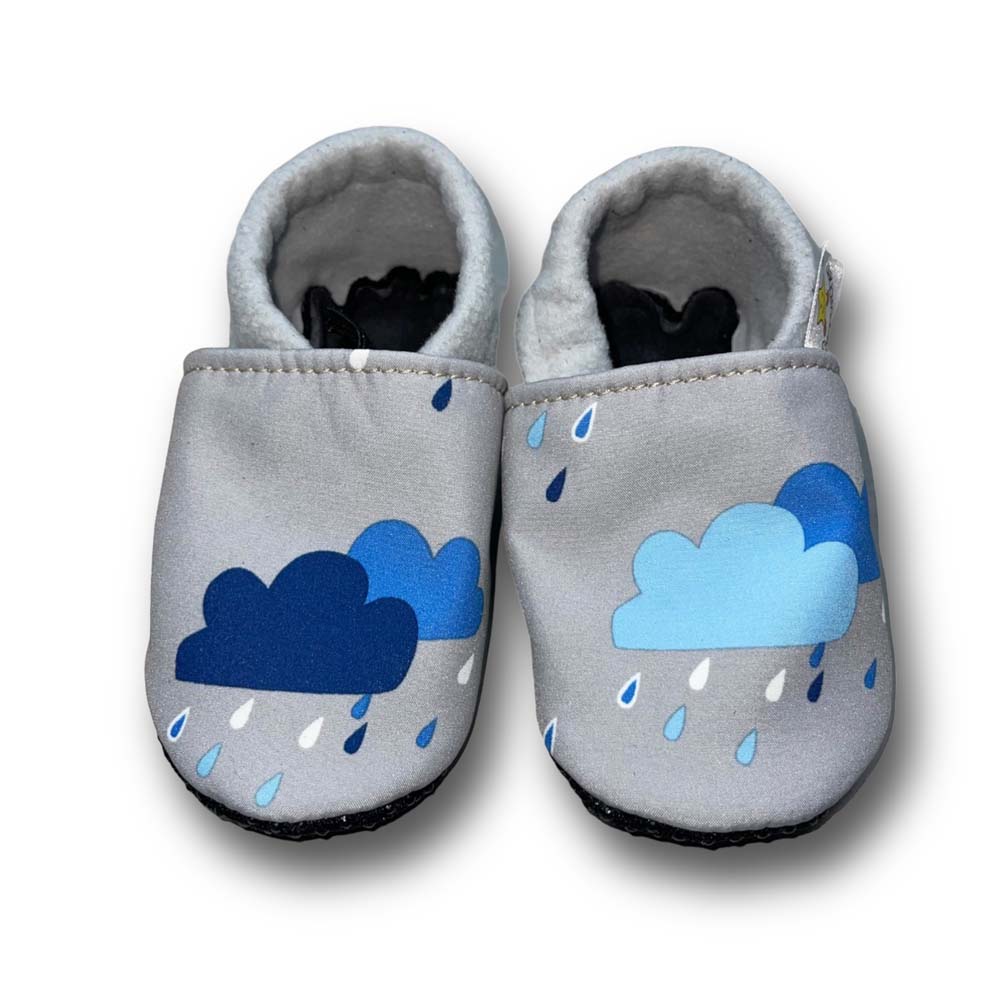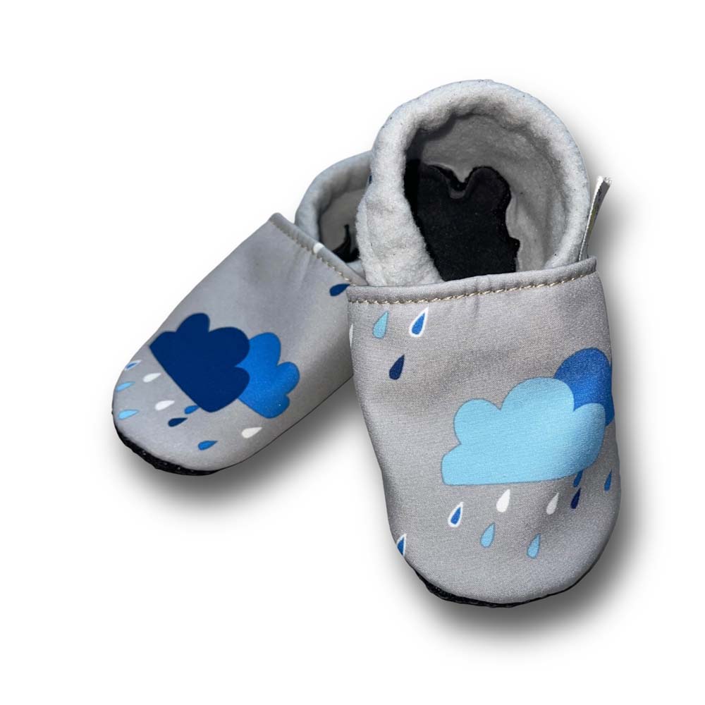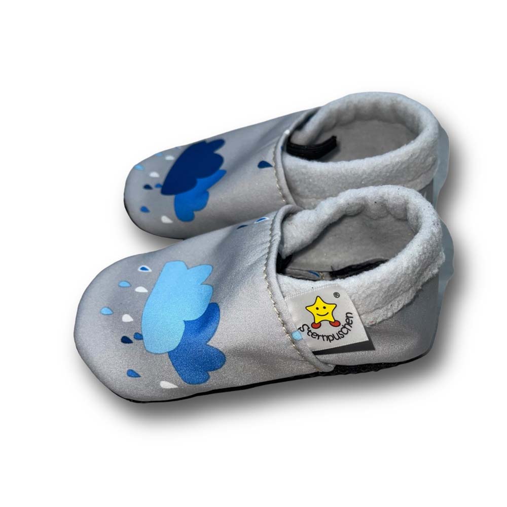 Vegane Krabbelpuschen grau mit blauen Wolken