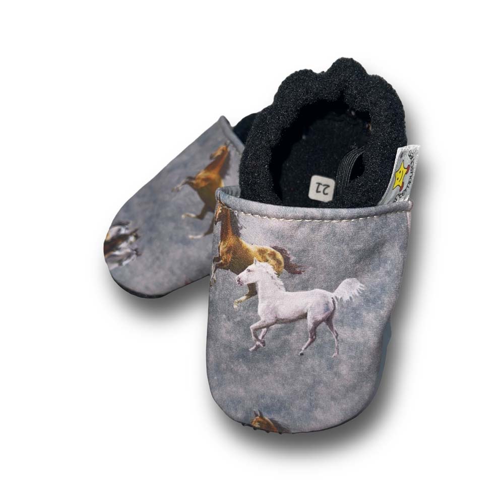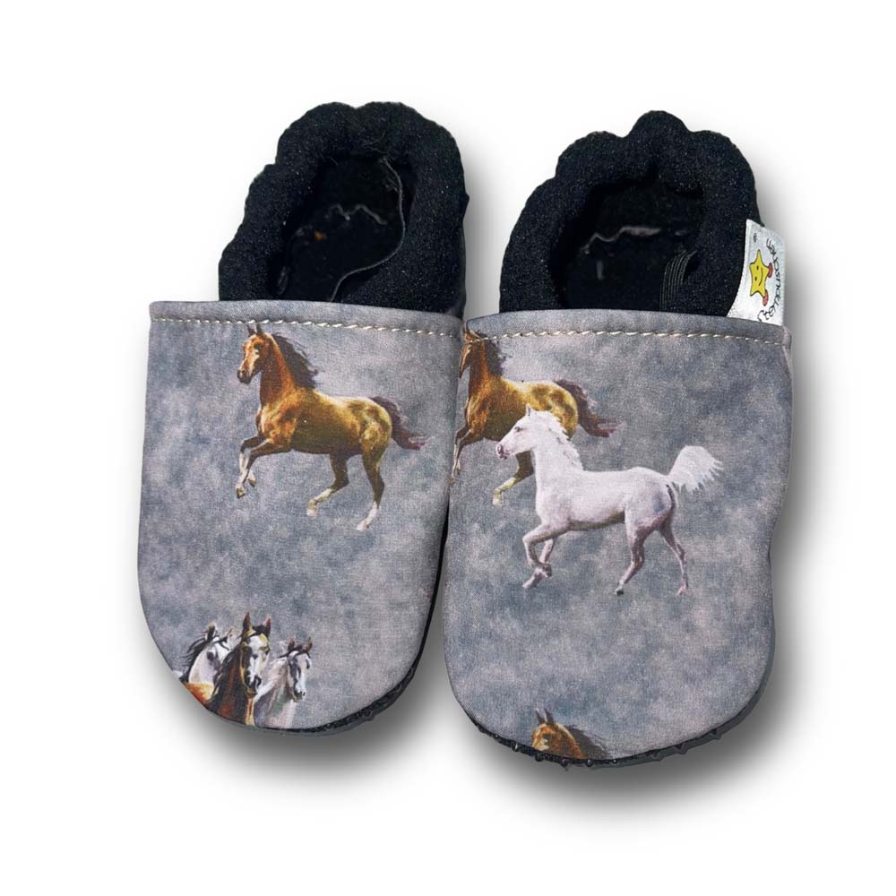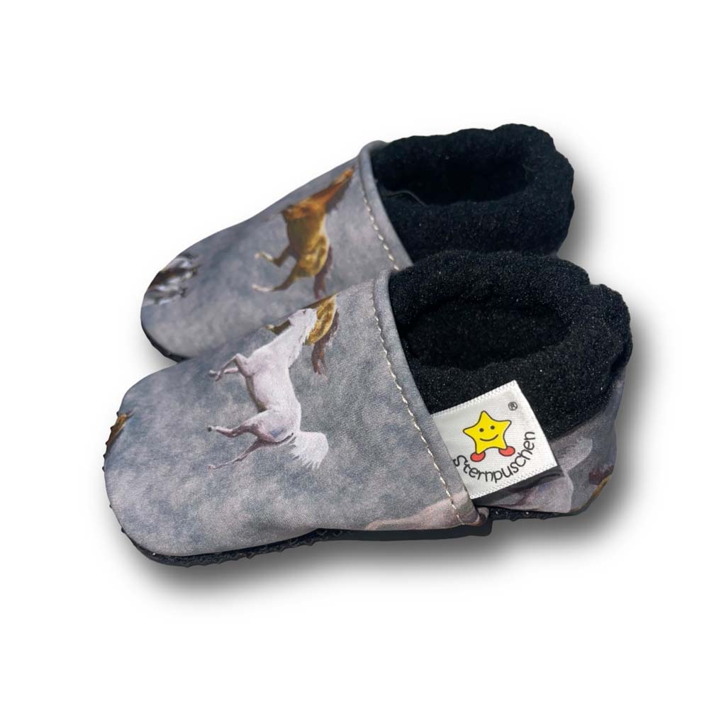 Mobile Preview: Vegane Krabbelpuschen Pferde auf grau