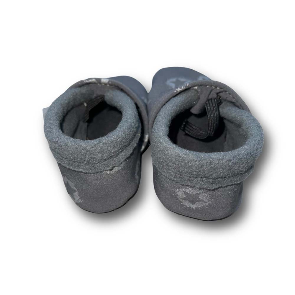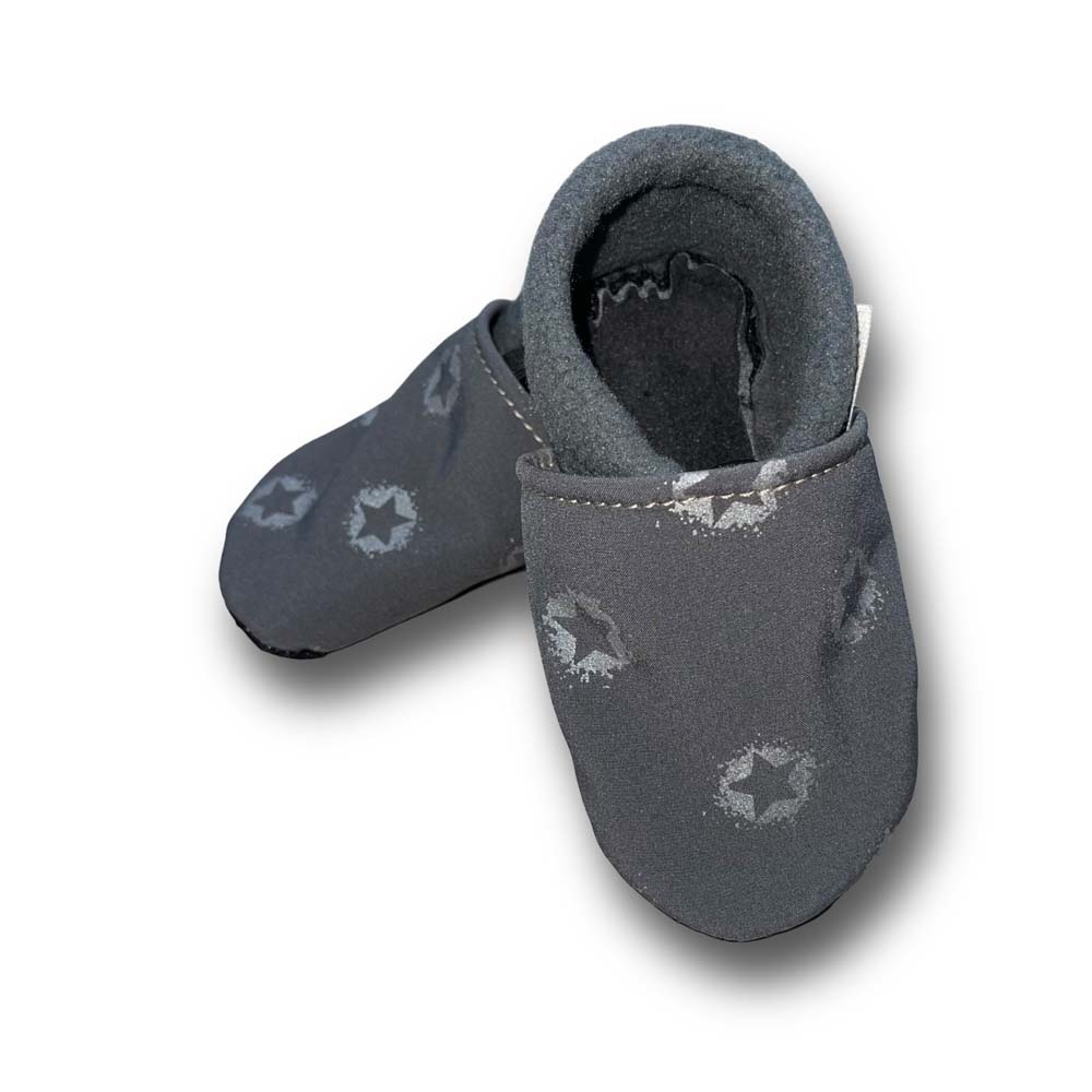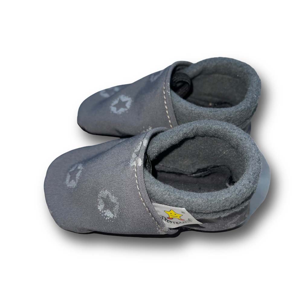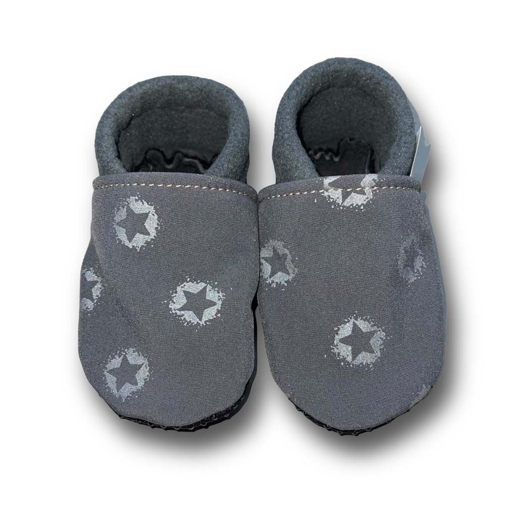Vegane Krabbelpuschen Sterne auf grau