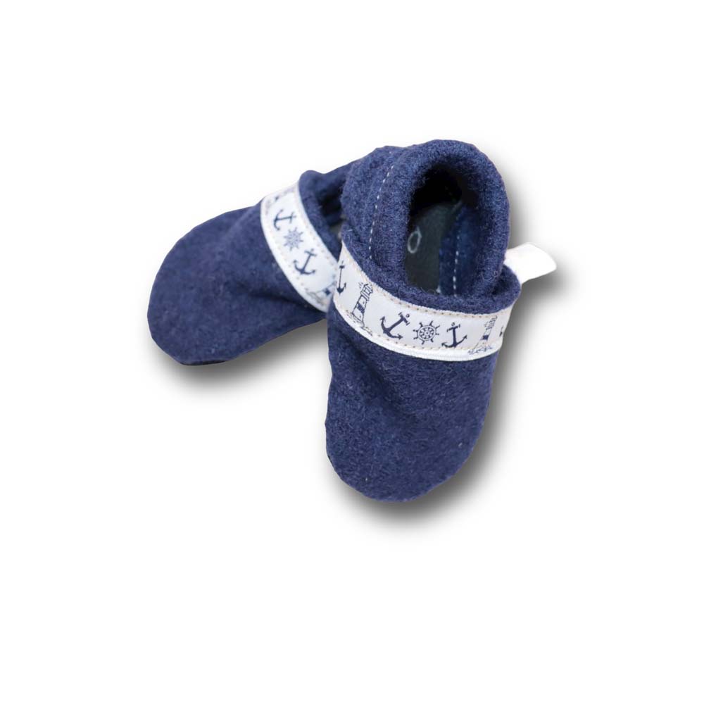 Preview: Walkloden-Puschen blau mit Webband Anker