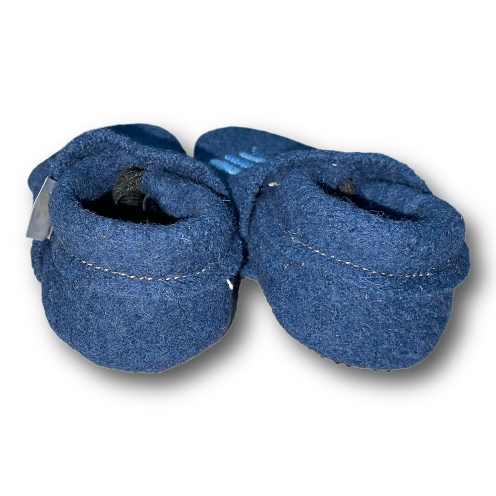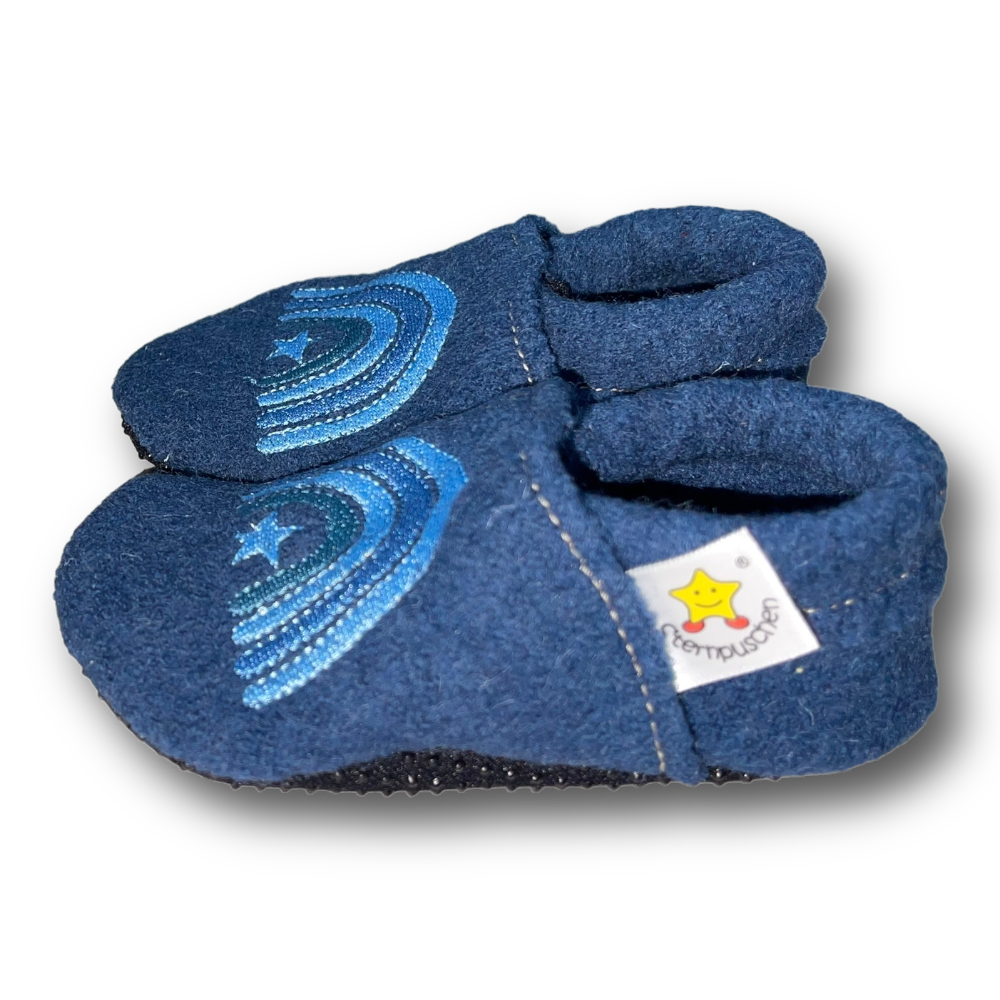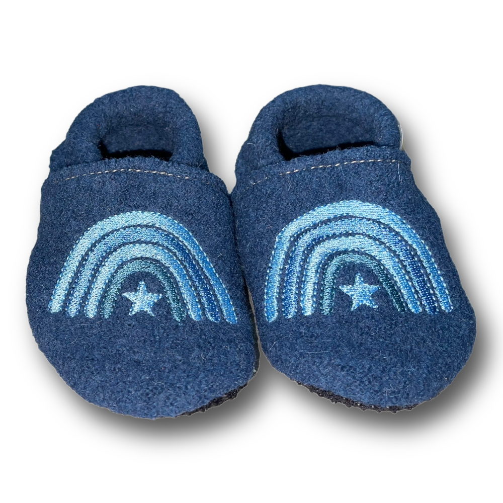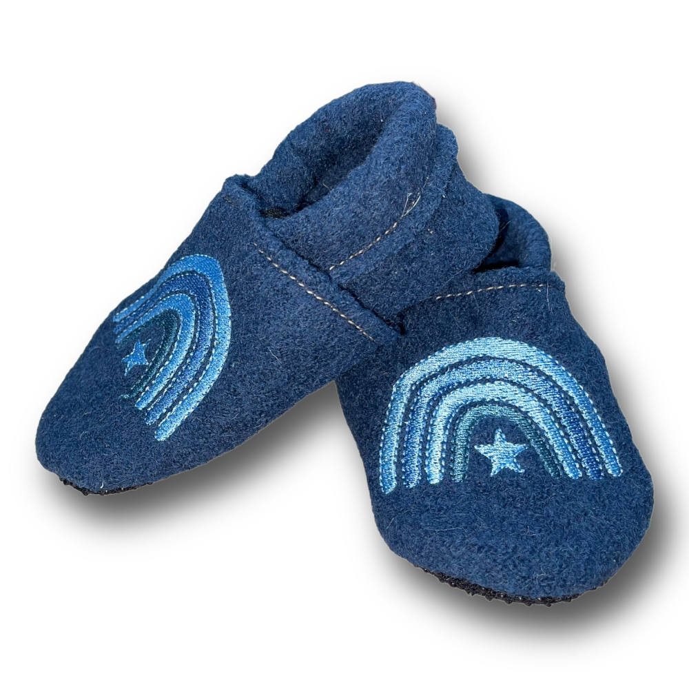 Walkloden-Puschen Regenbogen auf taubenblau