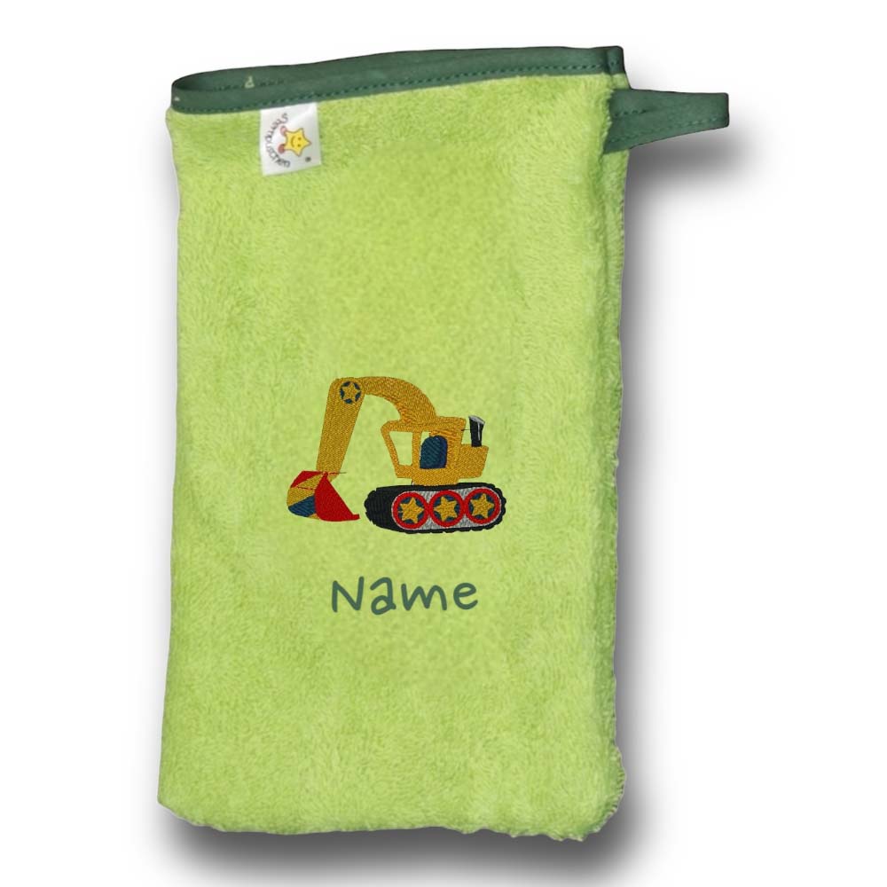 abgebildet ist, in diesem Fall Waschhandschuh-Waschlappen Bagger auf grün